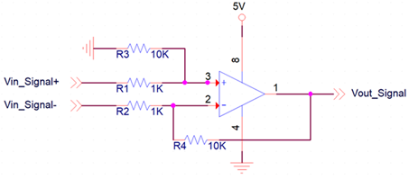 Differential Amplifier는 OP Amp로 입력되는 두 신호인 Vin_Signal+, Vin_Signal-의 전압 차를 외부 저항의 증폭비 만큼 증폭되어 출력된다.